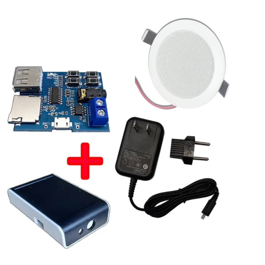 این محصول شامل 1 عدد اسپیکر سقفی هالوژنی SOS مدل SP301 و ماژول MP3 Decoder برند SOS (برد MP3 Decoder + باکس مخصوص + آداپتور اندرویدی MicroUSB + کارت حافظه SD) می باشد.